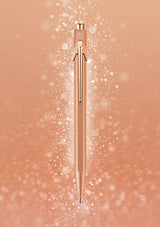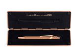 El refinado bolígrafo Brut Rosé 849 adorna un color rosa dorado que brilla al escribir. Clip dorado y pulsador. La famosa caja metálica ultra plana "tan delgada, tan glamurosa" adula su silueta elegante. Confort óptimo cuando se sostiene en la mano.