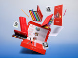 1 caja de cartón roja que contiene: 4 productos de la línea Classic + 5 accesorios + 3 clases creativas en línea
